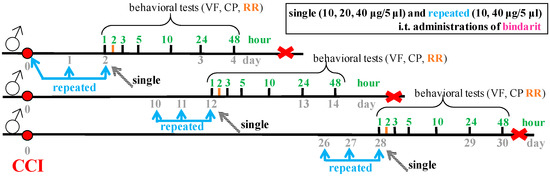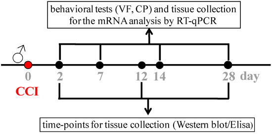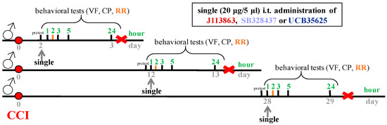 Chronic constriction injury of the sciatic nerve in mice was performed under isoflurane anesthesia according to the Bennet and Xie procedure [29]. An incision was made below the right hipbone, and the biceps femoris and gluteus superficialis were separated. The right sciatic nerve was exposed, and three ligatures (4/0 silk sutures) spaced 1 mm apart were loosely tied around the nerve distal to the sciatic notch until a brief contraction occurred in the operated hind limb. After surgery, mice had at least 2 days for recovery before behavioral measurements (von Frey test (VF), cold plate test (CP), rotarod test (RR)) were performed. For experiments without the use of drugs, behavioral testing and tissue collection were performed according to Scheme 1. Naive mice were chosen as a control for CCI-exposed animals, as in our previously published studies [12,30,31].
