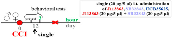 J113863 (CCR1 antagonist), SB328437 (CCR3 antagonist), and UCB35625 (CCR1/CCR3 antagonist) (all obtained from Tocris, Bristol, UK) were dissolved in 70% DMSO and administered once i.t. to operated male animals on the 2nd, 12th and 28th days post CCI at a dose of 20 μg/5 μL. Control animals received 70% DMSO (vehicle, i.t.) at the same time points. Intrathecal administrations were performed as described above. Three independent sets of experiments were performed; thus, different groups of animals were tested at each time point (early, middle and late phase of neuropathy). Behavioral testing was performed 1, 2, 3, 5 and 24 h after single drug administration according to Scheme 4.