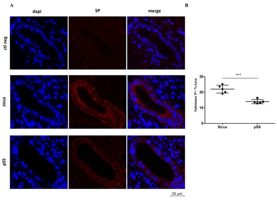 Chicago/Turabian StyleRosso, Pamela, Elena Fico, Serena Colafrancesco, Mario Giuseppe Bellizzi, Roberta Priori, Bruna Cerbelli, Martina Leopizzi, Carla Giordano, Antonio Greco, Paola Tirassa, and et al. 2023. "Involvement of Substance P (SP) and Its Related NK1 Receptor in Primary Sjögren’s Syndrome (pSS) Pathogenesis" Cells 12, no. 10: 1347. https://doi.org/10.3390/cells12101347