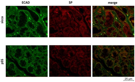 3.2. SP and ECAD Localization in MSG Sections from pSS and Sicca Patients’ Immunofluorescence