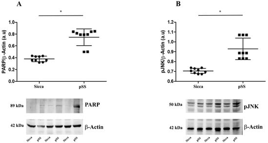 3.3. Western Blot Analysis Reveals Increase in PARP-1 Cleavage and JNK Phosphorylation in MSGs of pSS Patients
