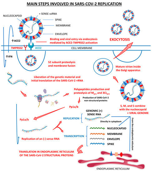 Main steps involved in SARS-CoV-2 replication. There are three host cells in which SARS-CoV-2 can replicate most effectively: nasal goblet epithelial cells, type 2 pneumocytes, and enterocytes. This virus enters the human organism through the nasal–oral route upon exposure. In response to this aggression, the body starts to respond by the activation of the innate immune system, which initiates producing interferon (IFN). These IFN molecules interact with the angiotensin-converting enzyme 2 (ACE2, the receptor for the SARS-CoV-2 attachment to the host cell) and activate it, opening the cells’ doors to the virus entrance. Mediated by the type II transmembrane serine protease 2 (TMPRSS2), SARS-CoV-2 fusions its membrane to the host cells and liberates its genome. The virus uses the host cells’ machinery to translate its (+) sense RNA genome into non-structural proteins, which are the main proteases Mpro or 3CLpro, and to replicate its (+) RNA into a (−) sense RNA that will be used to encode all the SARS-CoV-2 structural proteins, which are the spike (S), nucleocapsid (N), membrane (M), and envelope (E). After all these processes, the S, N, M, and E structural proteins combine with the viral genome, the virus is assembled into the Golgi apparatus of the host cells, and the mature SARS-CoV-2 virions are released to infect other susceptible cells. ↑, increase; Pp1a/b, polyproteins a/b.