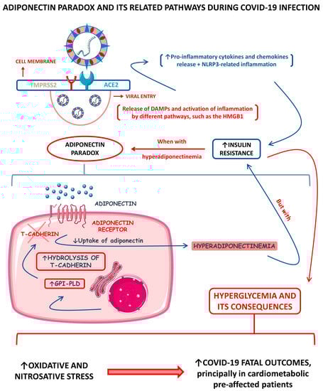 Across the COVID-19 pandemic, much has been said about the “adiponectin paradox” and how this condition can be caused during SARS-CoV-2 infection, principally among infected obese people. It is a fact that higher serum adiponectin levels drive insulin resistance (IR) down [93]. It is also known that during COVID-19, hyperglycemia happens principally among severely ill patients [94,95]. As commented above, the serum levels of adipokine adiponectin among COVID-19 patients differ primarily according to the patients’ disease severities. Among diseased individuals with hyperadiponectinemia and direct AT infection, there is speculation that the consequent hyperglycemia directly correlates with the occurrence of a SARS-CoV-2-inflammation-derived adiponectin paradox. Functionally, the adiponectin requires at least one of the AdipoR1 or AdipoR2 receptors to make its signal transduced, such as the glycosylphosphatidylinositol-anchored molecule, T-cadherin. In obesity, there is a reduction in adiponectin synthesis due to AT dysfunction but also an increase in the production of the glycosyl phosphatidylinositol-phospholipase D (GPI-PLD) enzyme. This enzyme hydrolyzes T-cadherin, consequently reducing the functional, active T-cadherin molecules, and promotes a decrease in adiponectin sequestration by the responsive tissues. This reduced sequestration causes an even more substantial reduction in adiponectin’s signal transduction and increases adiponectin’s presence in the bloodstream. This process, therefore, creates the paradox that although adiponectin serum levels are high, insulin sensitivity is remarkably impaired due to the strongly decreased adiponectin signal transduction. Among infected individuals with hyperadiponectinemia, it is believed that the adiponectin paradox can happen due to the hyperproduction of pro-inflammatory cytokines, which also leads to the cytokine storm [96,97,98].