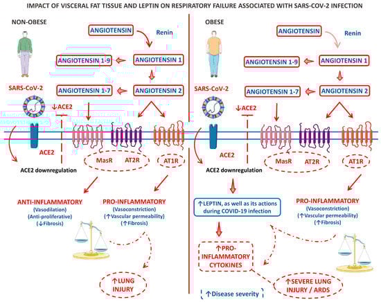 People with extensive visceral adipose tissue (VAT) also present IR, hypertension, and leptin resistance. These conditions bring obese people to a constant low-grade pro-inflammatory state, which is accelerated when the obese get infected by SARS-CoV-2. The ACE2 receptor also suppresses leptin levels by the MrgD-receptor/c/Src/p38MAPK pathway, which means that with SARS-CoV-2 compromising the function of the ACE2 receptor, the leptin levels can rise. These events probably result in a hyperinflammatory state locally in the pulmonary tissue infected by SARS-CoV-2, which involves local leptin receptors and the proper ACE2 disbalance. This hyperinflammatory state caused partly by leptin can be explained by the clinical studies that encountered higher leptin serum levels predicting disease severity during COVID-19 infection [114,115,116].