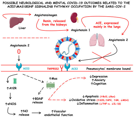 The altered hemodynamics during COVID-19 has also been implicated to be derived from the ACE2 dysregulations. Although without complete clarity, some authors hypothesized that ACE2 impairments were also responsible for the dysregulations of some essential proteins, such as Mas proteins, that regulate normal brain function due to the stimulation for the production of neurotrophic factors, such as the BDNF. This molecule exerts critical roles in neurodevelopment and neurogenesis, as well as in inhibiting neurodegeneration and maintaining normal behavior by modulating mood stability and cognition function. According to this hypothesis, decreases in the ACE2 number and activity during COVID-19 could trigger neural disturbances that lead to acute and long-term neural alterations and sequels, respectively. The theory proposes that decreased ACE2 activity results in reduced production of BDNF. The downregulation of BDNF can lead to increased oxidative stress, neuroinflammation, and neuro-apoptosis, which can cause long-lasting mental disorders such as anxiety, depression, and cognitive impairment. These effects could persist throughout the illness or as a sequel [152,153].