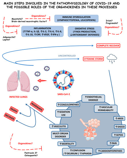 Organokines are involved with the burden of inflammation, development of cardiorenal injuries, disease progression, control of symptoms and disease severity, lung tissue repair, immunological regulation or dysregulation, and SARS-CoV-2-mediated acute sarcopenia in COVID-19 [15,16,17,18]. Some studies have shown that organokines are highly associated with adipocyte dysfunction in this condition. Moreover, they can be related to endothelial injuries, leading to significant disease severity. Higher levels of specific organokines were also associated with multiple organ failure, such as encephalitis [19,20,21,22].