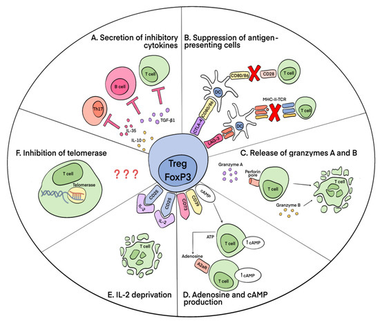 - Schmidt, A.; Oberle, N.; Krammer, P.H. Molecular Mechanisms Oftreg-Mediatedt Cell Suppression. Front. Immunol. 2012, 3, 51. [Google Scholar] [CrossRef] [PubMed]