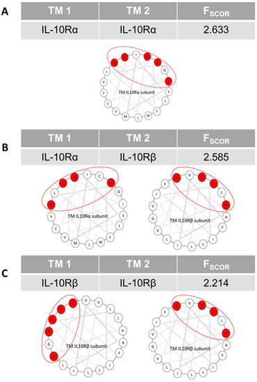 Predictions of IL-10R TM subunits interactions using PREDDIMER software. For each pair of TM sequences, this figure shows the PREDDIMER-calculated FSCOR and helical top views of the sequences. The grey triangles correspond to a helical turn of three amino acids. The circled areas represent the interaction interfaces. The amino acids in red are those implicated in the interaction, with the buried surface area values greater than or equal to 60%. (A) Prediction for IL-10Rα TM domain homodimerization. (B) Prediction for IL-10Rα/IL-10Rβ TM domain heterodimerization. (C) Prediction for IL-10Rβ TM domain homodimerization.