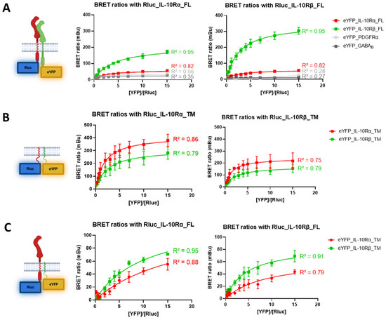 BRET validation of full length (FL) and transmembrane (TM) IL-10R subunits interactions. BRET saturation assays were performed to monitor the interaction of different pairs of proteins. The concentration of Rluc plasmid was kept constant for each condition (0.75 ng/mL), while the concentration of eYFP plasmid was increased in each condition. (A) BRET assay for full length receptors. Left graph shows the interactions of IL-10Rα with IL-10Rβ (N = 8), IL-10Rα (N = 8), PDGFRα (N = 2) and GABAB (N = 2). Right graph shows the interactions of IL-10Rβ with IL-10Rβ (N = 8), IL-10Rα (N = 8), PDGFRα (N = 2) and GABAB (N = 2). (B) BRET assay for TM sequences of the receptors. Left graph shows the interactions of IL-10Rα_TM with IL-10Rβ_TM (N = 6) and IL-10Rα_TM (N = 6). Right graph shows the interactions of IL-10Rβ_TM with IL-10Rβ_TM (N = 6) and IL-10Rα_TM (N = 6). (C) BRET assay for interactions of full-length receptors and TM sequences. Left graph shows the interactions of IL-10Rα_FL with IL-10Rβ_TM (N = 4) and IL-10Rα_TM (N = 4). Right graph shows the interactions of IL-10Rβ_FL with IL-10Rβ_TM (N = 4) and IL-10Rα_TM (N = 4). R2 are the coefficients of determination of the one site-specific binding non-linear fit curves.