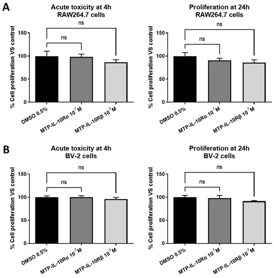 MTT assay for peptides. MTT assays, performed to assay peptides’ acute toxicity (4 h assay) and antiproliferative effect (24 h assay). RAW264.7 or BV2 cells were exposed to a 10−7 M concentration of MTP-IL-10Rα or MTP-IL-10Rβ peptides during 4 or 24 h, before measuring cell metabolic activity with tetrazolium dye. (A) MTT assay on RAW264.7 cells at 4 (left graph) or 24 h (right graph). (B) MTT assay on BV2 cells at 4 (left graph) or 24 h (right graph). ns: non-significant, Kruskal–Wallis test. Data are presented as mean ± SEM. N = 3 for each condition.