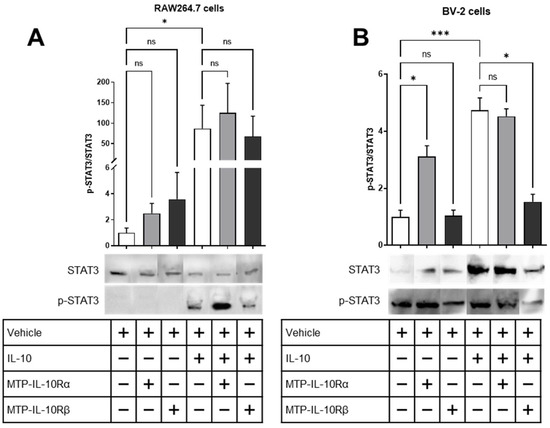 Measure of STAT3 phosphorylation in presence of IL-10 and peptides. Assessment of STAT3 phosphorylation by Western blot on lysates of RAW264.7 or BV2 cells exposed to IL-10 and/or DMSO or DMSO-diluted peptides. Graphs show the p-STAT3/STAT3 ratio. (A) p-STAT3/STAT3 ratio for the lysates of RAW264.7 cells exposed to DMSO 0.1% ± IL-10 (10 ng/mL), MTP-IL-10Rα (10−7 M) ± IL-10 or MTP-IL-10Rβ (10−7 M) ± IL-10. Photographs of the representative blots are presented on the right. N = 4. (B) p-STAT3/STAT3 ratio for the lysates of BV2 cells exposed to DMSO 0.1% ± IL-10 (10 ng/mL), MTP-IL-10Rα (10−7 M) ± IL-10 or MTP-IL-10Rβ (10−7 M) ± IL-10. Photographs of the representative blots are presented on the right. Full blots are presented in Figure S1. N = 5. *** p < 0.001; * p < 0.05; ns: non-significant; Kruskal–Wallis test. Data are presented as mean ± SEM.