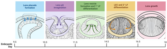 During early embryogenesis, the morphogenesis of the eye lens begins with the proximal interaction between the surface head ectodermal cells with the evaginating optic vesicle, resulting in a thickening of this apposing ectoderm to become the lens placode. The apical constriction of these cells leads to placode invagination to form the lens pit, which will separate from the neighbouring head ectoderm to form the hollow lens vesicle. The cells at the anterior aspect of the lens vesicle will differentiate to form the lens epithelium, while the posterior lens vesicle cells elongate to form the primary lens fibre cells. The elongation of these primary fibres that extend to reach the overlying epithelium rids the vesicle of its lumen to form the basic structure of the lens [1,2]. From this point onwards, the lens continues to grow, as proliferating epithelia at the lens equator exit the cell cycle and elongate and differentiate to form secondary fibre cells, displacing the older fibre cells towards the centre of the lens [1,2]. As fibre cells mature, there is autophagy of their nuclear material and organelles, and the formation of specialized membrane interdigitations, as they acquire their distinctive transparency, a characteristic that allows the lens to perform its primary function to transmit and focus light onto the retina [3].