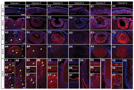 Distribution of glypican core proteins in the developing mouse eye. Mid-sagittal sections from embryonic day-9.5 (E9.5; (A1–F1)), E10.5 (A2–F2), E11.5 (A3–F3), E14.5 (A4–F4), and E16.5 (A5–A8,B5–B8,C5–C8,D5–D8,E5–E8,F5–F8) FvB/N mice. Sections labelled for glypican-1 (A1–A8), glypican-2 (B1–B8); glypican-3 (C1–C8), glypican-4 (D1–D8), glypican-5 (E1–E8), or glypican-6 (F1–F8) HSPG core proteins (red). Nuclei counterstained with Hoechst dye (blue). Yellow arrowheads indicate nuclear localisation (A4,A5,A7,A8,B4,B5,B7,B8,C7). White arrowheads indicate the staining of lens fibre cell tips (A3). Dotted lines indicate lens equator (A8). Lens placode (lpl), head ectoderm (ect), preplacodal matrix (ppm), optic vesicle (ov), lens pit (lp), optic cup (oc), lens vesicle (lv), anterior lens epithelium (epi), primary lens fibre cells (1° lf), secondary lens fibre cells (2° lf), cornea (cor), retina (ret), ciliary body (cb), iris (ir), germinative zone (gz), transitional zone (tz), anterior lens capsule (ac), and posterior lens capsule (pc). Scale bars = 25 µm. Images in figures are oriented with ventral side positioned to the right and the dorsal side to the left.