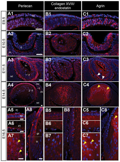 Distribution of high-molecular-weight HSPG core proteins in the developing mouse eye. Mid-sagittal sections from embryonic day-9.5 (E9.5; (A1–C1)), E10.5 (A2–C2), E11.5 (A3–C3), E14.5 (A4–C4), and E16.5 (A5–A8,B5–B8,C5–C8) FvB/N mice. Sections labelled for perlecan (A1–A8), collagen-XVIII/endostatin (B1–B8), or agrin (C1–C8) HSPG core proteins (red). Nuclei counterstained with Hoechst dye (blue). Yellow arrowheads indicate nuclear localisation (A7,C4,C7,C8). White arrowheads indicate the staining of the lens fibre cell tips (C3). Dotted lines indicate the lens equator (A8). The lens placode (lpl), head ectoderm (ect), optic vesicle (ov), lens pit (lp), optic cup (oc), lens vesicle (lv), anterior lens epithelium (epi), primary lens fibre cells (1° lf), secondary lens fibre cells (2° lf), cornea (cor), retina (ret), ciliary body (cb), iris (ir), germinative zone (gz), transitional zone (tz), anterior lens capsule (ac), and posterior lens capsule (pc). Scale bars = 25 µm. Images in figures are oriented with ventral side positioned to the right and the dorsal side to the left.
