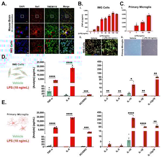 Immortalized mouse microglia (IMG cells) recapitulate features of primary microglia (PMg). (A) IMG cells express Iba1 and TMEM119, canonical markers of resident microglia of the mouse brain. The mouse brain images in the middle row are zoomed insets of the top row images, indicated by the white boxes in the image directly above. IMG cells (B(i)) (n = 3/group) and PMg (C(i)) (n = 5 or 7/group) secrete TNF-α in a dose-response manner to increasing doses of LPS 24 h after application. Additionally, representative morphological changes induced by a 10 ng/mL LPS challenge are similar between IMG cells ((B(ii))—via immunochemical staining) and PMg ((C(ii))—via light phase contrast microscopy). (D,E) Further analysis of the vehicle (0 ng/mL LPS)- and LPS (10 ng/mL)-treated cells from B revealed similar cytokine expression profiles in IMG cells (D) and PMg (E). LPS induces a significant increase in the production of TNF-α, IL-6, KC/GRO, IL-10, IL-1β, and IL-12p70 in both IMG cells (D) and PMg (E). Unpaired t-tests were used to compare vehicle vs. LPS-treated samples (* = p < 0.05, ** = p < 0.01, *** = p < 0.001, and **** = p < 0.0001); error bars represent mean ± SEM. Samples with analyte concentrations below assay detection limit are depicted in red and are assumed equivalent to 0 pg/mL to allow for statistical analysis. Brain microglia and IMG cells in (A) (scale bar = 20 μm); inset of single microglial cells in (A) (scale bar = 10 μm); IMG cells in (B(ii)) (scale bar = 50 μm). All ELISA experiments were normalized to MTS viability assays.