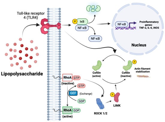 LPS (TLR4)-mediated inflammation and its interplay with RhoA activation and the downstream ROCK signaling pathways. LPS triggers the liberation of NF-κB from IκB, allowing for the NF-κB nuclear translocation and initiation of pro-inflammatory gene transcription. LPS also triggers the dephosphorylation of cofilin, which is the terminus of the RhoA/ROCK signaling pathway. Some of the effects of RhoA/ROCK signaling on inflammation remain elusive.