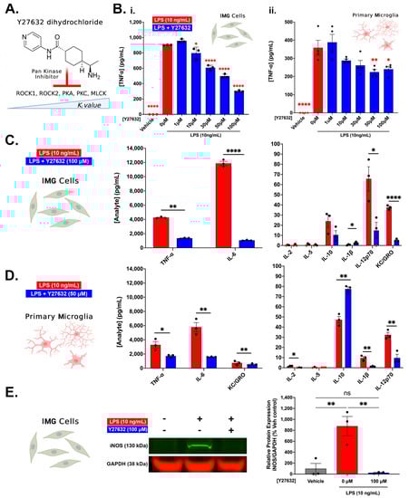 Pan kinase inhibition via Y27632 dihydrochloride reduces TLR4-initiated inflammatory response in IMG cells and PMg. (A) Chemical structure for Y27632 dihydrochloride. (B) Against an LPS challenge (10 ng/mL), TNF-α presence in media from IMG cells ((B(i)), n = 3/group) and PMg ((B(ii)), n = 4/group) decreases in a dose-response manner to increasing doses of Y27632. (C) Multiplex analyte analysis of Y27632 (100 μM) pre-treated IMG cells from (B) confirms significant reductions in TNF-α as well as the pro-inflammatory cytokine/chemokines IL-6, KC/GRO, and IL-12p70 when compared to LPS treatment alone. Y27632-pre-treated IMG cells show a minor, albeit significant, increase in the production of IL-1β. (D) Similar trends in Y27632 (50 μM)-pre-treated PMg from (B) (n = 3/group) were observed in the multi-analyte analysis. Significant TNF-α reductions were confirmed with equal or greater magnitude decreases in IL-6, IL-2, IL-1β, and IL-12p70 also observed. The anti-inflammatory cytokine IL-10 shows significant increases in the 50 μM pre-treated PMg. Whole-cell IMG cell lysates probed via Western Blot for iNOS (normalized to GAPDH protein) (E) show modulation of iNOS protein with LPS treatment and pretreatment with Y27632 (100 μM). Analyte samples with concentrations below the assay detection limit are shown as red data points and are assumed equivalent to 0 pg/mL to allow for the statistical analysis. In (B,E), one-way ANOVA with Dunnett’s comparison (vs. 0 μM Y27632) and Tukey’s comparison, respectively, were used. In (C,D), unpaired t-tests were used to compare LPS-treated vs. Y27632-pre-treated cells. Error bars represent mean ± SEM; (ns = not significant, * = p < 0.05, ** = p < 0.01, and **** = p < 0.0001). All ELISA experiments were normalized to MTS viability assays). Although the multiplex assay used in (C,D) also measured IL-4 and IFN-γ, no measurable analyte was observed and, hence, is not shown.