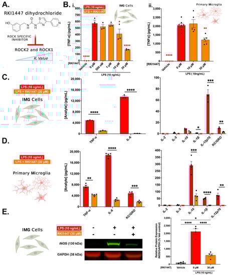 ROCK1 and ROCK2 inhibition via RKI1447 dihydrochloride is sufficient to block TLR4-initiated inflammatory response in IMG cells and PMg. (A) The chemical structure for the ROCK1 and ROCK2 specific inhibitor RKI1447 dihydrochloride is shown. (B) Against an LPS (10 ng/mL) challenge, TNF-α detected in in media from IMG cells ((B(i)), n = 3/group) and PMg ((B(ii)), n = 5 or 7/group) decreases in a dose-response manner to increasing pretreatment doses of RKI1447. (C,D) Multiplex analyte analysis of 30 μM pre-treated IMG cells from (B) confirms significant reductions in TNF-α as well as the pro-inflammatory cytokine/chemokines IL-6, KC/GRO, IL-12p70, IL-1β and the anti-inflammatory IL-10. (D) Similar trends in 30 μM pre-treated PMg from (B) (n = 3/group) were observed in the multiplex analyte analysis, confirming significant TNF-α reductions, along with significant decreases in IL-6, KC/GRO, IL-12p70, IL-1β, and the anti-inflammatory IL-10. Whole-cell IMG cell lysates probed via Western blotting for iNOS (normalized to GAPDH protein) (E) show significant increases in protein with LPS treatment and significant decreases in cells pre-treated with RKI1447. In (B,E), one-way ANOVA using Dunnett’s comparisons (vs. 0 μM RKI1447) and Tukey’s comparisons, respectively, were used. In (C,D), unpaired t-tests were used to compare LPS-treated vs. RKI1447-pre-treated cells. Analyte samples with concentrations below the assay detection limit are shown in red and are assumed equivalent to 0 pg/mL to allow for statistical analysis. Error bars represent mean ± SEM; (* = p < 0.05, ** = p < 0.01, *** = p < 0.001, and **** = p < 0.0001). All ELISA experiments were normalized to MTS viability assays. Although the multiplex assay used in (C,D) also measured IL-4 and IFN-γ, no measurable analyte was observed and hence is not shown.