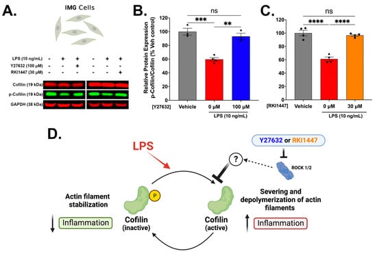 Cofilin plays a dynamic role in actin filament binding, severing, and depolymerizing activities and is downstream of the ROCK signaling pathway. The activation of ROCK induces the phosphorylation of cofilin (at the Ser3 position); however, cofilin is only active in its dephosphorylated state []. Recently, cofilin was shown to mediate the LPS-induced inflammatory response in a spontaneously immortalized microglial cell line (SIM-A9) []. Additionally, cofilin knockdown or inhibition in a mouse model of hemorrhagic brain injury improved behavioral outcomes, reduced oxidative stress, and decreased microglial activation []. The Western blot analysis of LPS-treated IMG cells without Y27632 (p = 0.0004) or RKI1447 (p < 0.0001) treatment shows significant decreases in the ratio of phosphorylated cofilin to total cofilin (~40%) (Figure 5A–C). Both Y27632 (100 μM) (p = 0.0011) (Figure 5B) and RKI1447 (30 μM) (Figure 5C) restore the ratio of phosphorylated cofilin/total cofilin to vehicle treatment levels. As ROCK activation results in the increased phosphorylation of cofilin, ROCK inhibition likely blocks an alternative pathway that has not been currently explored (Figure 5D).