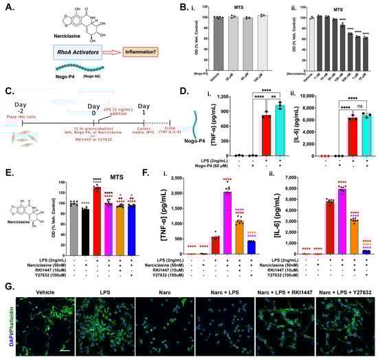 RhoA activation in IMG cells is not sufficient to induce an inflammatory response but exacerbates that response in the presence of a submaximal LPS challenge. (A) Narciclasine (Narc) and Nogo-P4 are RhoA activators. (B) MTS assays of IMG cells treated with Nogo-P4 (i) and Narc (ii) were used to assess the toxicity of various concentrations of each peptide/compound (n = 3/group). (C) Schematic of experimental setup for D-G. (D) TNF-α (i) and IL-6 (ii) production in IMG cells treated with Nogo-P4, LPS, and Nogo-P4 + LPS combination. (n = 3/group). (E) MTS viability assay for Narc (50 nM) ± LPS (2 ng/mL) and Narc (50 nM) + LPS (2 ng/mL) + Y27632 (100 μM) or RKI1447 (10 μM). (n = 7 or 8/group). MTS OD values from (E) are the same as the samples analyzed in (F) and were used to normalize data in (i) and (ii). (F) TNF-α and IL-6 ELISA data from the same treatments shown in (E). (G) Representative confocal images (40× magnification) of IMG cells stained for phalloidin (filamentous actin) and DAPI from all treatment groups from (E,F) (scale bar = 50 μm). One-way ANOVA was used for (B,D–F), with Dunnett’s and Tukey’s multiple comparison tests used, respectively, for the statistical analysis. Analyte samples with concentrations below the assay detection limit are shown in red and are assumed equivalent to 0 pg/mL to allow for statistical analysis. Error bars represent mean ± SEM. (ns = not significant, * = p < 0.05, ** = p < 0.01, and **** = p < 0.0001, with the color of the asterisks corresponding to the comparison group in (E,F)).