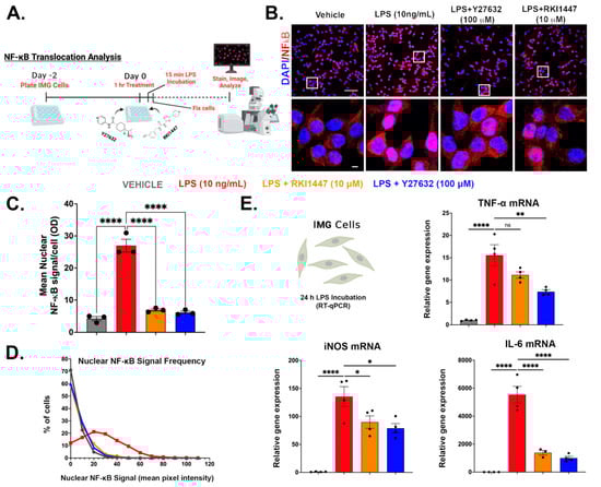 Y27632 and RKI1447 block NF-κB nuclear translocation and pro-inflammatory gene production in IMG cells. (A) Schematic of experimental timeline for (B–D). (B) Representative confocal images of NF-κB immunoreactivity (red) and DAPI (nuclei, blue) in IMG cells following LPS (10 ng/mL) challenge ± pretreatment of RKI1447 (10 μM) or Y27632 (100 μM). White boxes represent insets shown in the bottom panel. (C) Average nuclear NF-κB signal per cell for treatments shown in B (n = 3). (D) All cells analyzed in C were combined into a single histogram to represent the overall treatment effect. (E) Inflammatory gene production (TNF-α, IL-6, and iNOS) in IMG cells at 24 h post-LPS treatment (10 ng/mL) was reduced by RKI1447 (10 μM) and Y27632 (100 μM) pretreatment (n = 3 or 4/group). One-way ANOVAs were used in (C,D) using Tukey’s and Dunnett’s (vs. LPS treatment) multiple comparison tests, respectively. Error bars represent mean ± SEM (ns = not significant, * = p < 0.05, ** = p < 0.01, and **** = p < 0.0001).