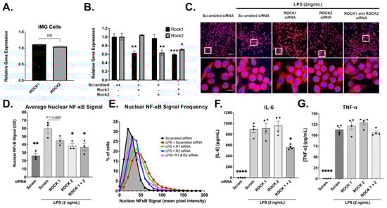 Although evidence exists for the differential roles of ROCK1 and ROCK2 [,,], the separate contributions of these proteins to the inflammation process have not been previously explored. We used a siRNA approach using IMG cells to assess the roles of ROCK1 and ROCK2 in an LPS-induced inflammatory challenge. Both ROCK1 and ROCK2 are expressed similarly in IMG cells (Figure 8A). ROCK1 and ROCK2 siRNAs applied for 24 h are specific and significantly knock down the target genes of ROCK1 (37.2% decrease, p = 0.0014) and ROCK2 (36.6% decrease, p = 0.0016) when combined in the same treatment (40.6% decrease, p = 0.0006 and 29% decrease, p = 0.0109, respectively) vs. scrambled siRNA control-treated cells’ expression levels (Figure 8B). Following 24 h of siRNA treatment, the IMG cells were challenged with 2 ng/mL LPS for 15 min and probed for NF-κB protein localization, as in Figure 7. Representative images of these cells are shown in Figure 8C. The non-LPS-challenged scrambled siRNA-treated IMG cells have a significantly lower (p = 0.0007) nuclear NF-κB signal than the LPS-challenged cells. Notably, this baseline signal is higher than the non-siRNA-treated vehicle control cells in Figure 7. In the IMG cells challenged with LPS (2 ng/mL), the average nuclear NF-κB signal was significantly reduced by ROCK2 (p = 0.0144) and ROCK1 + ROCK2 (p = 0.0102) siRNA treatments when compared to scrambled siRNA. ROCK 1 siRNA treatment decreased the average nuclear NF-κB signal, almost reaching significance (p = 0.0897; Figure 8D). All individual IMG cells’ average nuclear NF-κB signals (from Figure 8D) are shown via a histogram, with lower signal distribution for the ROCK1, ROCK2, and ROCK1 + ROCK2 siRNA + LPS treatments when compared to scrambled siRNA + LPS treatment (Figure 8E). In addition to assessing NF-κB protein localization in the IMG cells, we also analyzed the effects of siRNA treatments on IL-6 (Figure 8F) and TNF-α (Figure 8G) production 24 h post-LPS challenge. IL-6 production from the LPS-challenged cells decreased only with ROCK1 + ROCK2 siRNA treatment (33.2% reduction, p = 0.0075) when compared to the scrambled siRNA treatment. TNF-α production was not affected by the siRNA treatments. The MTS assay is shown in Figure S4J.