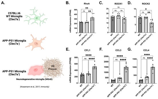 As shown herein, microglia are a dynamic cell type that can alter the phenotype and gene expression profiles in a context-dependent manner. Clec7a is a gene that was previously reported as a marker of disease-associated microglia (DAM []) lipid droplet accumulating microglia (LDAM []); and neurodegenerative microglia [,], with the latter two reported to be very detrimental to disease progression in mouse models of AD. Interestingly, all of these types of microglia possess distinct genetic profiles []. Previous studies have demonstrated that microglia respond to amyloid-β (Aβ) challenge by expressing a pro-inflammatory phenotype []. Here we show the previously published RNAseq (SMART Seq2 profile) mRNA expression levels of key RhoA/ROCK signaling genes [RHOA, ROCK1, ROCK2, and CFL1 (Cofilin)] and the regulators of inflammatory responses (CCL3 and CCL4) from microglia isolated from AD transgenic mice (both Clec7+ (MGnD) and Clec7−, and similarly aged (9 months) WT C57BL/J6 mice (Figure 9A; data from []). The AD mice, known as APP/PS1 mice, are double transgenic for mutations associated with early-onset AD, expressing a chimeric mouse/human amyloid precursor protein (APP) (Mo/HuAPP695swe) and a mutant human presenilin 1 (PS1-de9). Clec7a+ microglia are associated with amyloid-β (Aβ) plaques (Figure 9A), whereas the Clec7a− microglia are localized outside of plaque formations. The Clec7a− microglia from the APP/PS1 mice show no difference in the expression of RhoA, ROCK1, ROCK2, CFN1, CCL3, or CCL4 (Figure 9B–G) and show overall similar expression profiles to the microglia from WT, aged mice (from Figure 2C of []). RhoA, CFN1, CCL3, and CCL4 expression are significantly upregulated in Clec7a+ APP/PS1 “neurodegenerative” microglia when compared to WT microglia (p = 0.0020, p < 0.0001, p < 0.0001, and p < 0.0001, respectively) and Clec7a− APP/PS1 microglia (p = 0.0018, p < 0.0001, p < 0.0001, and p < 0.0001, respectively; Figure 9B,E–G). ROCK1 and ROCK2 are minimally expressed, with ROCK1 showing no changes among the three subtypes of microglia, with ROCK2 showing small but significant downregulation relative to other transcripts (mean expression in WT: 9.305 FPKM, APP/PS1 Clec7a−: 9.72 FPKM, and APP/PS1 Clec7a+: 6.261 FPKM) compared to WT (p = 0.0221) and APP/PS1 Clec7a− (p = 0.0098) microglia (Figure 9C,D).