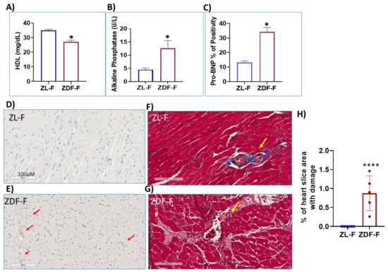 We reported previously that significantly higher levels of serum triglycerides were observed in young, adolescent, (5-month-old) obese ZDF-F rats fed with D12468 compared to age-matched healthy ZL-F rats [25]. Here we show that these ZDF-F rats also have reduced levels of plasma high-density lipoproteins (HDL) (Figure 1A) and increased levels of plasma alkaline phosphatase (ALP) (Figure 1B) compared to age-matched ZL-F rats. These observations are consistent with the metabolic effects of obesity and hyperglycemia on HDL and ALP in humans. It is well established that NT-proB-type Natriuretic Peptide (NT-pro-BNP) synthesized and secreted by the heart is increased during heart failure [31,32]. Immunohistochemistry using anti-NT-pro-BNP antibodies showed that compared to healthy ZL-F rat hearts (Figure 1C,D), ZDF-F rat hearts had increased brown color corresponding to anti-NT-Pro-BNP antibody positivity (Figure 1C,E; n = 5).