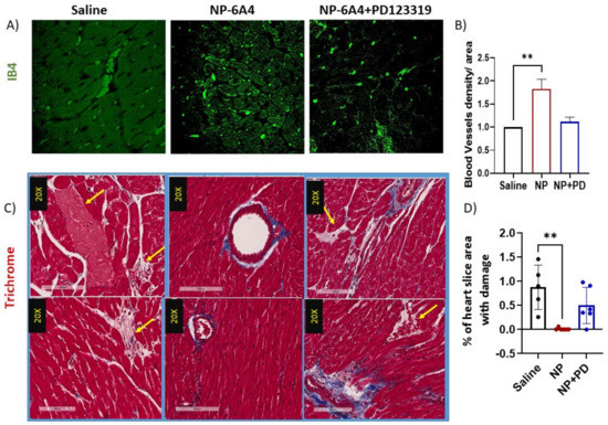 Effects of NP-6A4 and co-treatment with PD123319 on cardiac microvascular density and blood vessel damage in ZDF-F rats. Representative images of the heart sections of ZDF-F rats treated with saline and NP-6A4 and stained with endothelial marker Isolectin B4 (IB4) or Masson’s Trichrome are shown. NP-6A4-treated heart sections exhibit a doubling of IB4 signal indicating microvascular density increased by 200% in response to NP-6A4 compared to saline treatment (A,B). Co-treatment with PD123319 suppressed this effect (A,B) Scale bar: 50 µm. Trichrome-stained heart sections of ZDF-F rats treated with saline exhibit one or more regions of vascular damage indicated by pink-stained areas and marked by yellow arrows caused by cardiomyocyte loss and/or edema (C). This type of damage was not detected in five out of six ZDF-F rats treated with NP-6A4; however, ZDF-F rats treated with NP-6A4 + PD123319 showed similar vascular damage surrounding at least one blood vessel (C) Scale bar: 100 µm. (D) shows the quantification of damaged microvascular area as a percentage of the total whole heart slice area for ZDF-F rats treated with saline, or NP-6A4 or NP-6A4 + PD123319 (NP + PD) using Apeiro ImageScope annotation tools. ** p < 0.01.