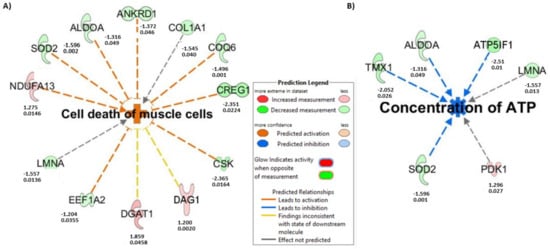 Effects of co-treatment with AT2R antagonist PD123319 on cardiac signaling of young ZDF-F rats. IPA analysis of differentially expressed proteins between NP-6A4 and NP-6A4+ PD123319-treated rat hearts 6 predicted that co-treatment with PD123319 resulted in activating a signaling network that (A) increases cell death of muscle cells (orange indicates activation: Z score: 1.943; p value = 0.0015) and another signaling network that (B) suppresses ATP concentration (blue indicates suppression: Z score: −1.982; p value =0.008) in the Diseases and Functions Category. Fold changes of each protein (top number below each protein) in heart lysates of ZDF rats treated with NP-6A4 + PD123319 versus those treated with NP-6A4 alone and corresponding p values (bottom number below each protein) are shown in (A,B).