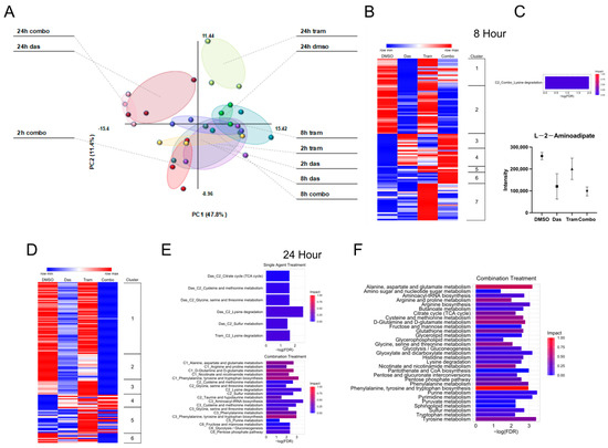 Dasatinib and trametinib treatments drive changes in metabolic activity. (A) Principal Component Analysis of metabolites in Cal62 cells after treatment with DMSO, 100 nM dasatinib (das), 100 nM trametinib (tram), or combination (combo) for 2, 8, and 24 h. (B) Changes in metabolite levels at 8 h were clustered and plotted on a heatmap. (C) Pathway analysis via MetaboAnalyst was performed on each cluster shown in B. (D) Metabolite levels at 24 h were clustered and plotted. (E) The clusters from D were analyzed using MetaboAnalyst. (F) Metabolites in the combo treatment when compared to DMSO were analyzed using MetaboAnalyst.
