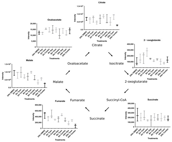 Levels of tricarboxylic acid pathway intermediates are altered by Src and MEK inhibition. Intermediates of the TCA pathway were pulled out from the metabolite dataset and quantified by intensity.