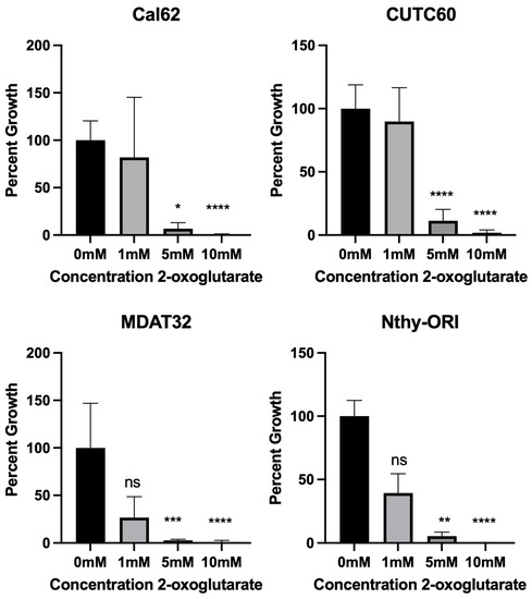 Increased levels of intracellular 2-oxoglutarate prevent cellular proliferation. Thyroid cells were treated with dimethyl 2-oxoglutarate, a membrane-soluble compound that is quickly metabolized to 2-oxoglutarate, for 72 h. Results shown are mean ± SD from three independent experiments performed in technical triplicate. Ordinary one-way ANOVA was performed in GraphPad Prism * p = 0.01, ** p = 0.0017, *** p = 0.0004, **** = p < 0.0001; ns = not significant.