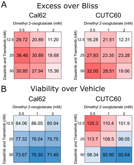 Low levels of dasatinib and trametinib exhibit synergistic activity with 2-oxoglutarate. Thyroid cancer cells were treated with a vehicle, dasatinib, and trametinib, and/or dimethyl 2-oxoglutarate, and viability was measured after 24 h. (A) Synergy was determined using excess over Bliss, where values > 1 indicate synergy and those <1 indicate antagonism. (B) Viability of the different treatment combinations indicated as percentages of the vehicle control. Results are compiled from 4 experiments with 3 technical replicates each.