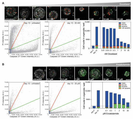 In addition, confocal imaging revealed distinct cellular responses to both drugs. Ten days of exposure to docetaxel (0.01–30 nM) did not elicit cell death (Figure 5A), but it did inhibit organoid growth (Figure 4A), supporting docetaxel’s cytostatic capacities. In contrast, 10-day enzalutamide exposure induced apoptotic cell death at a dose of 1 μM and higher (Figure 5B), while exerting a growth-inhibitory effect only at the highest doses (10 and 30 μM, Figure 4B).