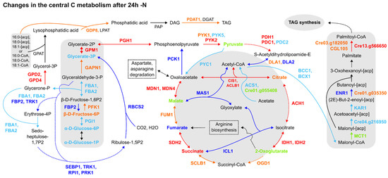 - Blaby, I.K.; Glaesener, A.G.; Mettler, T.; Fitz-Gibbon, S.T.; Gallaher, S.D.; Liu, B.; Boyle, N.R.; Kropat, J.; Stitt, M.; Johnson, S.; et al. Systems-Level Analysis of Nitrogen Starvation–Induced Modifications of Carbon Metabolism in a Chlamydomonas reinhardtii Starchless Mutant. Plant Cell 2013, 25, 4305–4323. [Google Scholar] [CrossRef] [PubMed]