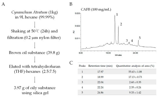 The Korean pharmacopeia standard root of Cynanchum atratum (Latin name: Radix Cynanchi Atrati) was obtained from the Jeong-Seong Pharmaceutical Company (Daejeon, Republic of Korea), where it originates from Northeast China. The powder of Cynanchum atratum (1 kg) was mixed with 9000 mL of extra-pure hexane (CAS: 110-54-3, DUKSAN, Aansan, Republic of Korea) for 24 h at 50 ℃. The total hexane extract of Cynanchum atratum (HCA) was used as a control. In the present study, filtration of the hexane supernatants using a 0.2 μm nylon filter and removal of volatiles resulted in a brown oily substance (39.80 g), which was subjected to silica gel column chromatography. The fraction was removed and eluted with a mixture of tetrahydrofuran (THF)-hexanes (2.5:7.5) until no spot on a Thin Layer Chromatography (TLC) plate was detected by 254 UV light. The removed portion was vacuum-dried to acquire Cynanchum atratum fraction A (CAFA). The eluting THF collected the remaining compounds in silica gel, and the yellow oily portion (3.97 g, 0.39%) was obtained and considered Cynanchum atratum fraction B (CAFB) after removing volatiles under reduced pressure (Figure 1A).