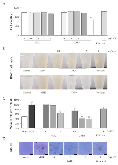 Melanin inhibition by CAFB in B16F10 cells. (A) Cell viability of HCA, CAFB, and Kojic acid in B16F10 was determined using an EZ-cytox cell viability detection kit. (B) The cell lysate of B16F10 was photographed. (C) The relative melanin contents were analyzed according to the OD value of B16F10 cell lysate. (D) The morphological change of B16F10 cells was photographed by the Olympus inverted fluorescent microscope (IX71, Tokyo, Japan) and digital camera (DP70, Tokyo, Japan). The length of the scale bars denotes 200 μm; ## p < 0.01, as compared to the normal; * p < 0.05, ** p < 0.01, as compared to the MSH.