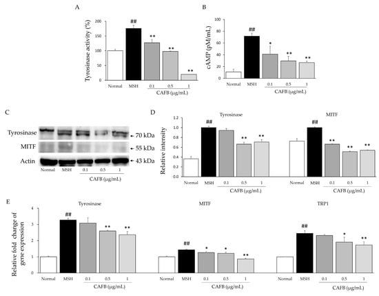Potential anti-melanogenic mechanisms of CAFB in vitro. (A) Tyrosinase activity and (B) cAMP content in B16F10 cells was determined. Both (C,D) Western blot and (E) real-time PCR were performed using a CAFB-treated B16F10 cell model. All of the detailed contents are shown in the Section 2. ## p < 0.01 as compared to the normal; * p < 0.05, ** p < 0.01 as compared to the MSH.