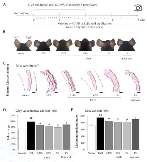 Forty-six six-week-old female C57BL/6j mice were obtained from Daehan Biolink (Gyeonggi-do, Republic of Korea). After 10 days of environment adaption at 22 ± 2 °C and 50% ± 10% humidity with chow diet ad libitum, six animals were assigned to the normal group, while the other animals were divided randomly into five groups of eight mice each. Except for the normal group, forty C57BL/6j mice were exposed to UVB for 1 h per day (100 mJ/cm2, 5 times/week) for 8 weeks. CAFB (0.25%, 0.5%, and 1% dissolved in pure Vaseline) was applied to the left ear after exposure to UVB, while the right ear served as the internal control. At the end of the experimental day, the ear melanin contents were quantitatively evaluated by the Mexameter system (MX 18; Courage and Khazaka Electronic GmbH, Cologne, Germany) according to the Mexameter melanin index (MMI). The gray value of each ear photo was also analyzed using ImageJ (1.52a, National Institutes of Health, Bethesda, MD, USA). Then, the whole blood was collected from the abdominal aorta under isoflurane inhalational anesthesia (Hana Pharm, Hwaseong, Republic of Korea). The complete blood count (CBC) was performed using an Exigo Eos Veterinary hematology analyzer (Boule Medical AB, Spanga, Sweden). The ear tissues were removed and stored at −70 °C for the next analysis.