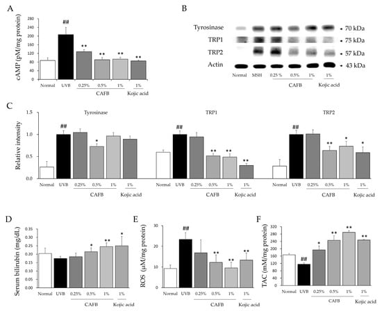 Potential anti-melanogenic mechanisms of CAFB in vivo. (A) cAMP content was determined by a cAMP Assay kit (R&D system; Minneapolis, MN, USA). (B,C) Left ear tissue was utilized for Western blot analysis of key proteins. (D) Serum bilirubin, as a potent endogenous antioxidant, was determined using an Auto Chemistry Analyzer (Chiron, Emeryville, CA, USA). (E,F) The levels of ROS and TAC in the left ear tissue were determined according to the corresponding methods. ## p < 0.01 as compared to the normal; * p < 0.05, ** p < 0.01 as compared to the UVB.