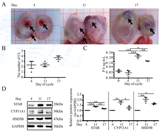 The morphology of goat ovaries at D4, D11 and D17 is shown in Figure 1A. The luteal color gradually changed from bright red to dark red, and the number of CLs is indicated in Figure 1B. The serum P4 concentration increased as CLs developed (Figure 1C), with the highest level on D11 (p < 0.01). The luteal expression of steroidogenic proteins increased on D11 (STAR, p < 0.001; CYP11A1, p < 0.01; HSD3B, p < 0.01) and D17 (STAR, p < 0.01; HSD3B, p < 0.05) compared with that on D4 (Figure 1D).