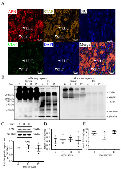 The concentrations of serum and luteal APN during the estrous cycle were also measured by ELISA. Both serum and luteal APN profiles (Figure 2D,E) and structures revealed no significant differences on D4, D11 and D17, and the APN content was about 1 ng/mg in sera and 10 ng/mg (per mg of total protein) in CLs.