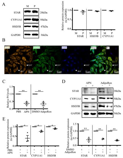 In order to determine the function of APN on luteal P4 synthesis, we first validated the middle luteal STAR, CYP11A1 and HSD3B expression levels, which were similar to pregnant stage (Figure 3A). Thus, pregnant CLs were used for the subsequent experiments. Luteal cells separated from the pregnant CL were identified by the STAR and HSD3B (Figure 3B) expressions in the cytoplasm. Then, recombinant APN and its receptor agonist AdipoRon were applied to treat the isolated cells, and the results showed that both the P4 concentration (p < 0.01, Figure 3C) and the STAR, CYP11A1 and HSD3B levels (Figure 3D,E) decreased at 24 h following treatment with 1 μg/mL APN (p < 0.05) or 25 μM AdipoRon (p < 0.01).