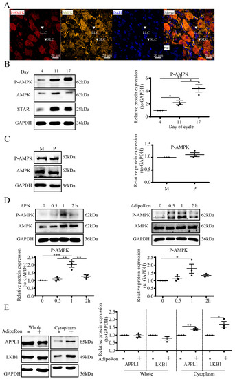 APN activates the AMPK signal in goat luteal steroidogenic cells. (A) Luteal tissue was paraffin-embedded and processed for mIHC. P-AMPK (dark red), AMPK (olive) and DAPI staining (blue) for nucleus. NC, negative control; SLC, small luteal cells; LLC, large luteal cells. Scale bar = 20 µm. (B) WB for P-AMPK, AMPK and STAR of cyclic CLs. (C) WB for P-AMPK in mid-cycle and pregnant CLs. M, mid-cycle; P, pregnancy. (D) Cells were treated with 1 μg/mL APN (left) or 25 μM AdipoRon (right) for 0, 0.5, 1 and 2 h to detect P-AMPK by WB. (E) Cells were treated with 1 μg/mL APN or 25 μM AdipoRon for 1 h to detect whole and cytoplasmic APPL1 and LKB1 by WB. Days 0, 4, 11 and 17 represent the days in the estrous cycle, with day 0 as the onset of estrus. Data are shown as means ± SEM. A Student’s t-test was used for the comparison of two datasets. A one-way analysis of variance was followed by a Tukey’s multiple comparisons test. Statistical significance is indicated with asterisks *, ** and ***, reflecting p values of <0.05, p < 0.01 and p < 0.001, respectively.