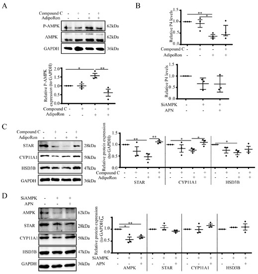 To investigate whether AMPK regulates luteal steroidogenesis, cells were incubated with Compound C (10 μM, inhibitor of P-AMPK) for 1 h, following by treatment with 25 μM AdipoRon for 1 h to detect the P-AMPK expression and 24 h to detect the steroidogenic protein expression. The results showed that AdipoRon induced P-AMPK expression (p < 0.05), and Compound C inhibited the AdipoRon-induced P-AMPK expression (p < 0.01, Figure 5A). Treatment with 25 μM AdipoRon for 24 h reduced the P4 release (p < 0.01). Although Compound C did not reverse the AdipoRon-reduced P4 release (Figure 5B upper), it reversed the AdipoRon-induced repression of steroidogenic proteins, including STAR (p < 0.01) and CYP11A1 (p < 0.05) (Figure 5C). For additional verification of the involvement of AMPK in APN-mediated steroidogenesis, we also suppressed AMPK by SiRNA (p < 0.05) and found that APN treatment failed to affect the P4 release (Figure 5B lower) or STAR, CYP11A1 and HSD3B expressions (Figure 5D).
