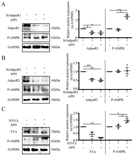 To explore the function of APN and its receptors in the control of luteal P-AMPK, luteal cells were first transfected with SiRNA (100 μM), and 48 h later, APN (1 μg/mL) was added to luteal cells for 1h to detect P-AMPK. The results showed that after the suppression of AdipoR1 by SiRNA (p < 0.05), APN treatment enhanced P-AMPK expression (p < 0.05, Figure 7A). However, after the suppression of AdipoR2 by SiRNA (p < 0.01), APN treatment failed to affect the increase in the P-AMPK expression (Figure 7B). The suppression of T-Ca by SiRNA (p < 0.05) achieved a similar result to AdipoR1 (Figure 7C).