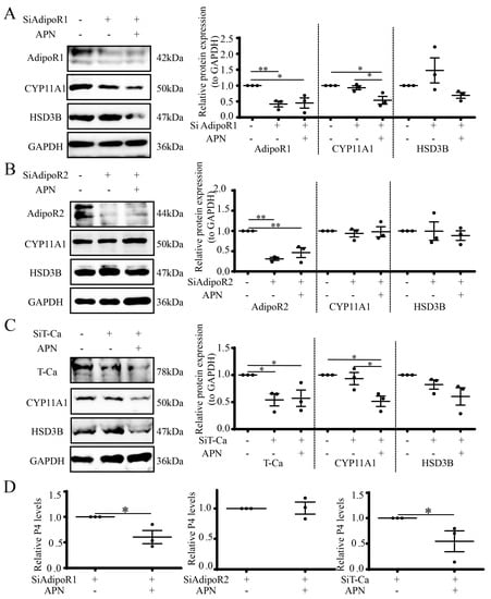To investigate the function of APN and its receptors in the control of luteal steroidogenesis, luteal cells were first transfected with SiRNA (100 μM), and 48 h later, APN (1 μg/mL) was added to luteal cells for 24 h to detect steroidogenic proteins and the P4 concentration. The results showed that after the suppression of AdipoR1 by SiRNA (p < 0.05), APN treatment reduced the CYP11A1 expression (p < 0.05) but not the HSD3B expression (Figure 8A). However, after the suppression of AdipoR2 by SiRNA (p < 0.01), APN treatment failed to affect the CYP11A1 and HSD3B expressions (Figure 8B). The suppression of T-Ca by SiRNA (p < 0.05) achieved a similar result to AdipoR1 (Figure 8C). The P4 concentration exhibited similar results to the CYP11A1 expression (p < 0.05) (Figure 8D).