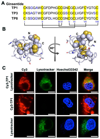 Ginsentides have two distinct advantages over most unconstrained peptide biologics of comparable size. First, ginsentides, containing about 25% cysteine, are highly cystine-braced, rendering them structurally compact and highly resistant to proteolytic degradation. Second, ginsentide TP1, the representative and most abundant ginsentide, is a cell-penetrating peptide and can target intracellular protein–protein interactions. Additionally, TP1 does not exhibit any toxic or membrane-damaging effects. In comparison, ginsenosides have poor bioavailability, thereby limiting their clinical applications [48]. TP1’s cell-penetrating property can also be found in certain highly cystine-braced microproteins, such as the plant-derived 8C-hevein-like peptides [20,21,22,23,24,28]. Thus, hyperstability and cell-penetrating properties of ginsentides are desirable attributes for drug development.