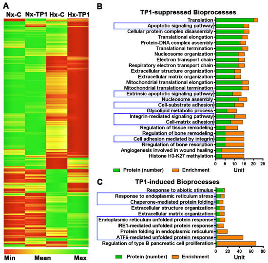 TP1-mediated differential protein synthesis in HUVEC-CS cells under normoxic and hypoxic conditions. (A) Heat map representing the relative abundance of newly synthesized proteins under the indicated experimental conditions. HUVEC-CS cells were treated with 20 µM TP1 for 24 h under normoxic or hypoxic conditions, respectively, and PBS was used as the vehicle control. A SILAC-based protein labeling approach was used to label the newly synthesized proteins, which were later quantified using a LC-MS/MS-based quantitative proteomic technique. Cluster analysis of the identified proteins was performed using the online bioinformatics tool Gene Pattern (http://genepattern.broadinstitute.org, accessed on 20 November 2017) with hierarchical clustering and Pearson’s correlation options. Vehicle control under normoxic (Nx-C) or hypoxic (Hx-C) conditions and TP1 treatment under normoxic (Nx-TP1) or hypoxic (Hx-TP1) conditions are shown. (B,C) Bioinformatics analysis of TP1-regulated bioprocesses in hypoxic HUVEC-CS cells. Figures represent TP1-suppressed bioprocesses (B) and TP1-induced bioprocesses (C) during 24 h of hypoxic stress.